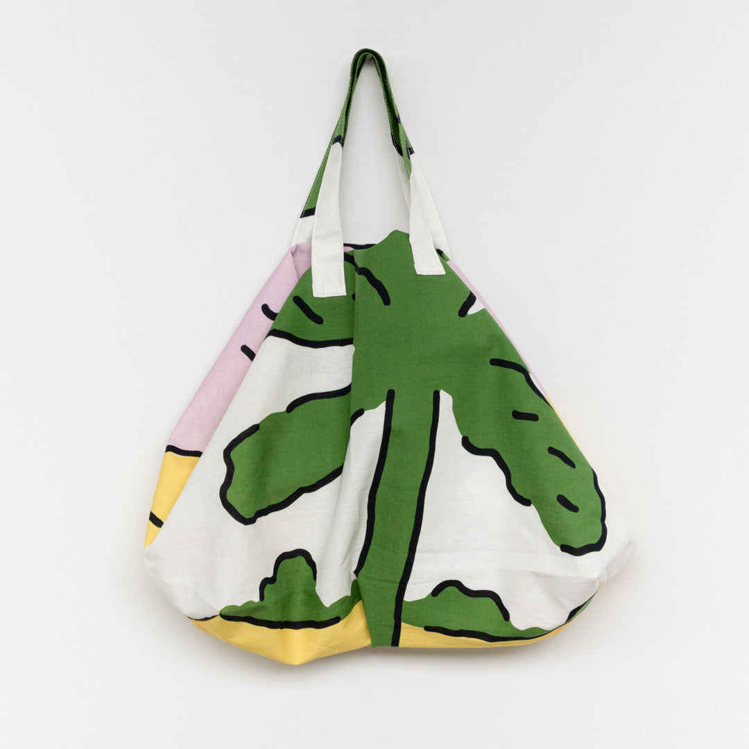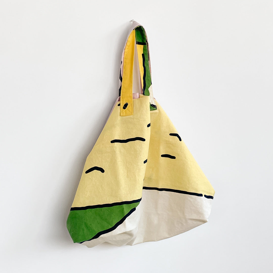 このバッグはカーテンとして使えなくなった布をアップサイクルして作られています。